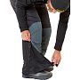 Брючная часть имеет высокий крой, полностью закрывающий поясницу и грудь, что исключает задувание ветра под куртку. Эластичные лямки с замками-фастексами позволяют быстро отрегулировать посадку по росту. Эргономичный крой коленей не сковывает движений при приседании или бурении лунок. В нижней части штанин расположены застежки-молнии с клапанами - это позволяет легко надевать комбинезон поверх объемных зимних сапог типа "пенка" (EVA).