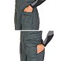 Штаны с высокой посадкой фиксируются регулируемыми лямками. Двухзамковая молния также защищена клапаном. В нижней части штанин предусмотрены застежки-молнии с клапанами, что позволяет надевать их поверх сапог. Крой коленей эргономичный, не мешающий приседать.