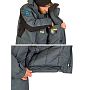 Куртка оснащена высоким воротником с флисовой подкладкой, который защищает шею от ветра. Капюшон с козырьком имеет регулировку по объему. Центральная двухзамковая молния закрыта ветрозащитным клапаном. Важным элементом являются дренажные отверстия и сетчатые вставки в подкладке - они необходимы для быстрого слива воды, если рыболов все-таки искупался и выбрался на лед. Рукава имеют эластичные внутренние манжеты и регулируемые внешние. Карманы для согрева рук оснащены влагозащитными молниями.