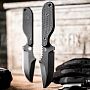 Особое внимание привлекает геометрия клинка. При длине лезвия 8,7 см, толщина обуха составляет внушительные 4,7 мм. Профиль клинка имеет элементы формы "гарпун" с массивной насечкой на обухе, что обеспечивает надежный упор для большого пальца при силовом резе. Рукоять сформирована накладками из композита G10. Их выпуклая форма и текстурированная поверхность гарантируют, что нож не провернется даже в мокрой ладони.