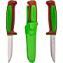 Рукоять выполнена из прочного полипропилена в цвете Dala Red (красный), а ножны - в цвете Ivy Green (зеленый плющ). Геометрия клинка сохранила классические скандинавские спуски (Scandi grind), сведенные в ноль без микроподводов. Рукоять имеет бочкообразную форму, которая отлично заполняет ладонь, и оснащена развитым упором, предотвращающим соскальзывание пальцев на режущую кромку.