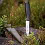 Сердцем ножа является клинок из немецкой углеродистой стали C100S, закаленной до твердости 58,5 HRC. В отличие от нержавеющих аналогов, углеродка обладает более жесткой структурой, что позволяет дольше удерживать бритвенную остроту режущей кромки даже при интенсивной работе по дереву. Геометрия клинка выполнена в классическом скандинавском стиле - Scandi grind. Спуски сведены в ноль без микроподводов, что превращает нож в идеальный инструмент для строгания и работы с волокнистыми материалами.