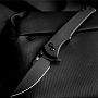 Клинок ножа изготовлен из нержавеющей стали марки 440A, которая известна своей отличной коррозийной стойкостью и легкостью в заточке. Черное защитное покрытие лезвия не только дополняет общий стиль, но и обеспечивает дополнительную защиту металла от воздействия влаги. Профиль клинка с декоративным рикассо и выраженным флиппером позволяет быстро и безопасно привести нож в рабочее положение.