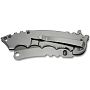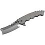 Рукоять полностью выполнена из нержавеющей стали, что обеспечивает ножу внушительный вес и ощущение монолитности в руке. На передней панели расположено объемное изображение черепа, которое также служит дополнительным элементом для улучшения хвата. За безопасность отвечает замок типа Framelock, где частью фиксирующего механизма является сама плашка рукояти. Это одна из самых надежных систем блокировки клинка в открытом состоянии. Для открытия предусмотрены сразу два варианта: подпальцевый флиппер и двухсторонний шпенек.