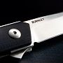 Особого внимания заслуживает механика и рукоять. Клинок извлекается мгновенно при помощи миниатюрного плавника (флиппера) благодаря системе керамических шарикоподшипников в осевом узле. Ход клинка плавный и четкий. Рукоять сформирована облегченными стальными лайнерами, на которых закреплены накладки из G10. Этот стеклотекстолит обладает высокой прочностью, не боится влаги и перепадов температур. Текстурированная поверхность обеспечивает надежное сцепление с ладонью. За фиксацию клинка отвечает проверенный замок Linerlock.