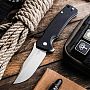 Рукоять сформирована накладками из текстурированного G10 черного цвета. 3D-фрезеровка поверхности гарантирует, что нож не выскользнет даже из мокрой или жирной ладони. Открытие производится мгновенно нажатием на плавник (система флиппер), а плавность хода обеспечивается качественной подгонкой механики. За фиксацию клинка отвечает проверенный временем замок Linerlock, пластина которого надежно запирает пятку клинка.