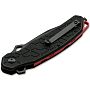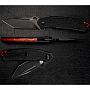 Рукоять выполнена из черного композита G10. Накладки имеют уникальную текстуру в виде медовых сот (Honeycomb), которая не только эффектно выглядит, но и обеспечивает "мертвое" сцепление с ладонью. Ярким акцентом служит спейсер из красного алюминия, контрастирующий с общей черной гаммой. В торце рукояти интегрирован стеклобой, расширяющий функционал ножа до аварийно-спасательного инструмента. Открытие производится мгновенно с помощью плавника (флиппера), а фиксация клинка - надежным стальным лайнером замка Linerlock.