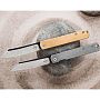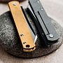 Рукоять изготовлена из латуни (Brass). Металлические плашки имеют обработку Stonewash, которая искусственно состаривает поверхность, скрывая мелкие царапины. Со временем латунь покроется естественной патиной, делая каждый экземпляр уникальным. Конструкция рукояти предельно проста и надежна - здесь нет лайнеров, что позволило снизить толщину. Механизм фиксации - классический Slipjoint. Клинок удерживается в открытом положении пружиной, при этом жесткой блокировки нет. Открытие производится двумя руками, что добавляет процессу использования определенный ритуал и спокойствие.