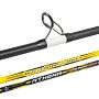 Особого внимания заслуживает система пропускных колец. Удилище оснащено высококачественной фурнитурой Fuji KW с рамами из нержавеющей стали и вставками из оксида алюминия (Aluminium Oxide). Геометрия рам (противозахлестная) и двойная обмотка ножек гарантируют надежность при использовании толстых шок-лидеров и плетеных шнуров, а также полную защиту от агрессивной соленой среды.
