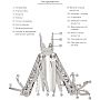 - Високоякісні матеріали: Всі елементи мультитула, включаючи рукоятку, виготовлені з високоякісної нержавіючої сталі. Клинок та ножиці виконані зі сталі марки 440, що забезпечує їх міцність та стійкість до корозії. Решта інструментів та рукоятка виготовлені зі сталі марки 420, яка також відрізняється високою міцністю та довговічністю.