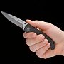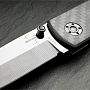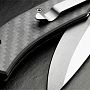 Руків'я являє собою конструкцію з карбону (Carbon Fiber). Переплетення вуглецевих волокон не тільки створює заворожуючий візуальний 3D-ефект, а й забезпечує неймовірну міцність при мінімальній вазі. Відкриття проводиться вручну за допомогою двостороннього шпенька, а фіксацію клинка гарантує надійний замок Linerlock. Попри легкість, конструкція відчувається монолітною та збитою.