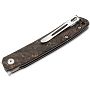 Руків'я - це справжній витвір мистецтва. Воно виготовлене з матеріалу FAT Carbon сіро-коричневого відтінку з вкрапленнями золотистих ниток. Цей композит не тільки неймовірно красивий, граючи на світлі, а й має високу міцність при мінімальній вазі. Механіка відкриття базується на системі Front Flipper (фронтальний фліпер). Елегантний важіль у передній частині руків'я дозволяє плавно та ефектно відкрити ніж великим пальцем. Фіксація клинка здійснюється надійним замком Linerlock із нержавіючої сталі.