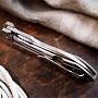 Головною перевагою ножа є клинок, виконаний із сучасної азотистої сталі Nitro-V. Цей сплав спочатку розроблявся для висококласних кухонних ножів, тому він має виняткову корозійну стійкість, високу в'язкість (не кришиться при навантаженнях) і здатність набувати бритвеної гостроти. Форма клинка - модифікований Wharncliffe. Пряма різальна кромка та опущений кінчик роблять цей профіль ідеальним для точних, контрольованих розрізів. Поверхня металу оброблена методом Stonewash, що приховує дрібні подряпини, неминучі при експлуатації.