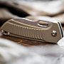 Конструкція руків'я гібридна. Лицьова плашка виготовлена з композиту G10 пісочно-коричневого кольору з глибокими вертикальними канавками, які забезпечують надійне зчеплення з долонею. Тильна сторона виконана з нержавіючої сталі та є частиною замка Framelock. Механіка ножа побудована на шарикопідшипниках, що забезпечує плавний хід клинка. Відкриття здійснюється мануально, за допомогою довгастого отвору в клинку (Thumb Hole), зручного для роботи як голою рукою, так і в рукавичках.
