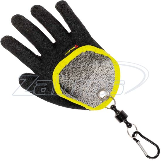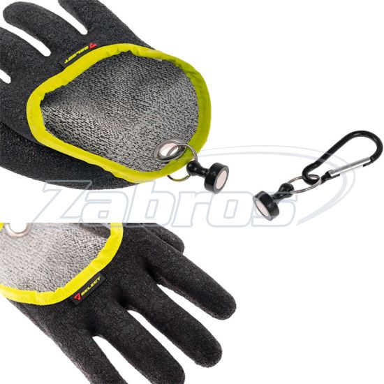 Однією з головних особливостей моделі Pike-II є унікальна система кріплення. Рукавичка оснащена потужним магнітним тримачем, з'єднаним із карабіном. Це дозволяє зафіксувати її на D-подібному кільці рибальського жилета, поясі штанів або на сумці. У потрібний момент рукавичка від'єднується від магніта одним рухом, а після використання так само легко повертається на місце, буквально притягуючись до тримача. Вам не потрібно шукати її по кишенях або турбуватися, що вона впаде у воду - вона завжди під рукою і готова до роботи.